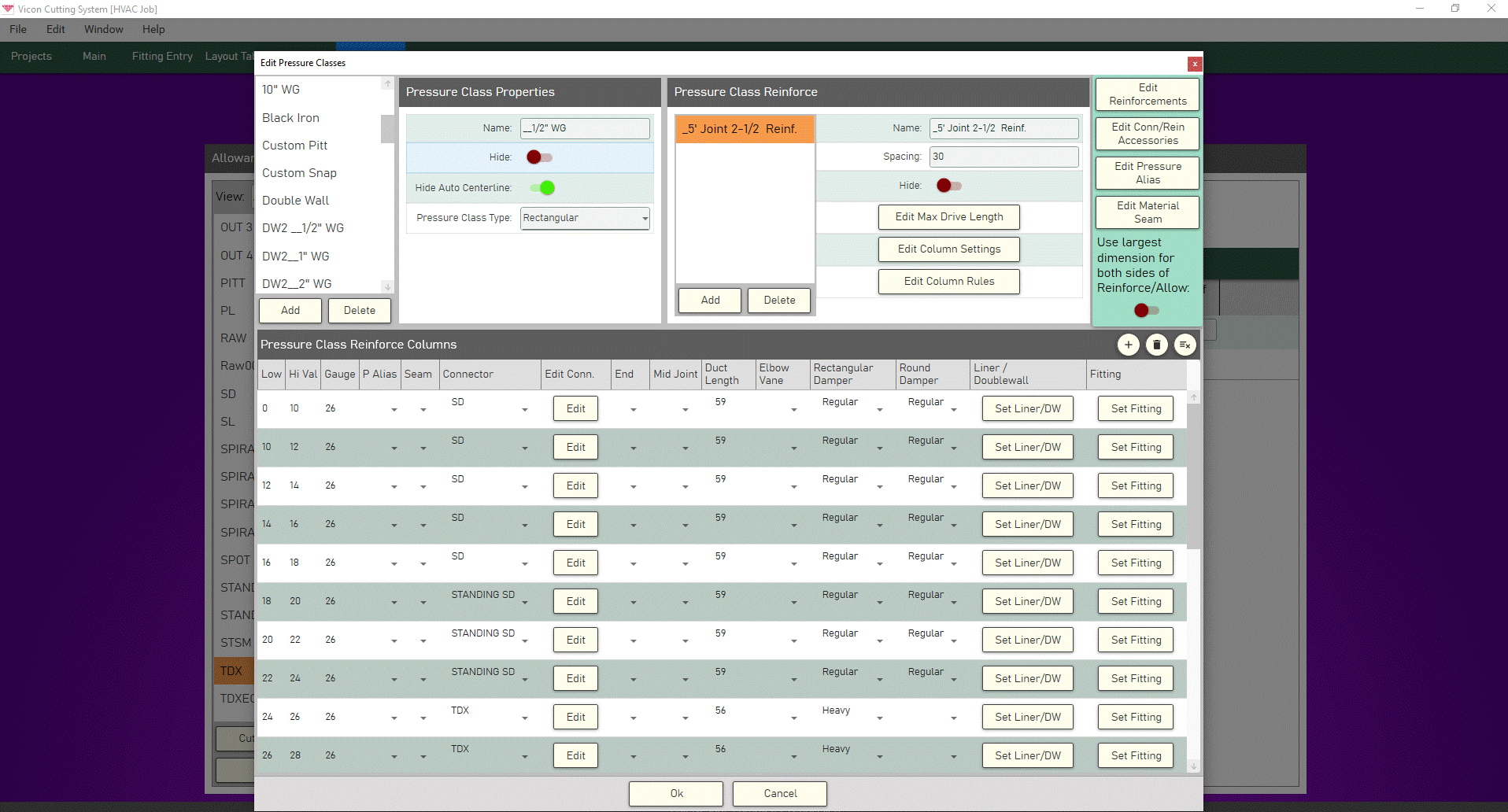 The Vicon HVAC program comes preloaded with SMACNA recommendations for fabrication as interpreted. The Vicon pressure classes automatically choose material gauge, seams, connections and reinforcements to make your fittings and duct work as economical as possible. Depending on your equipment and methods and specifications, you may choose to add your own pressure class settings.